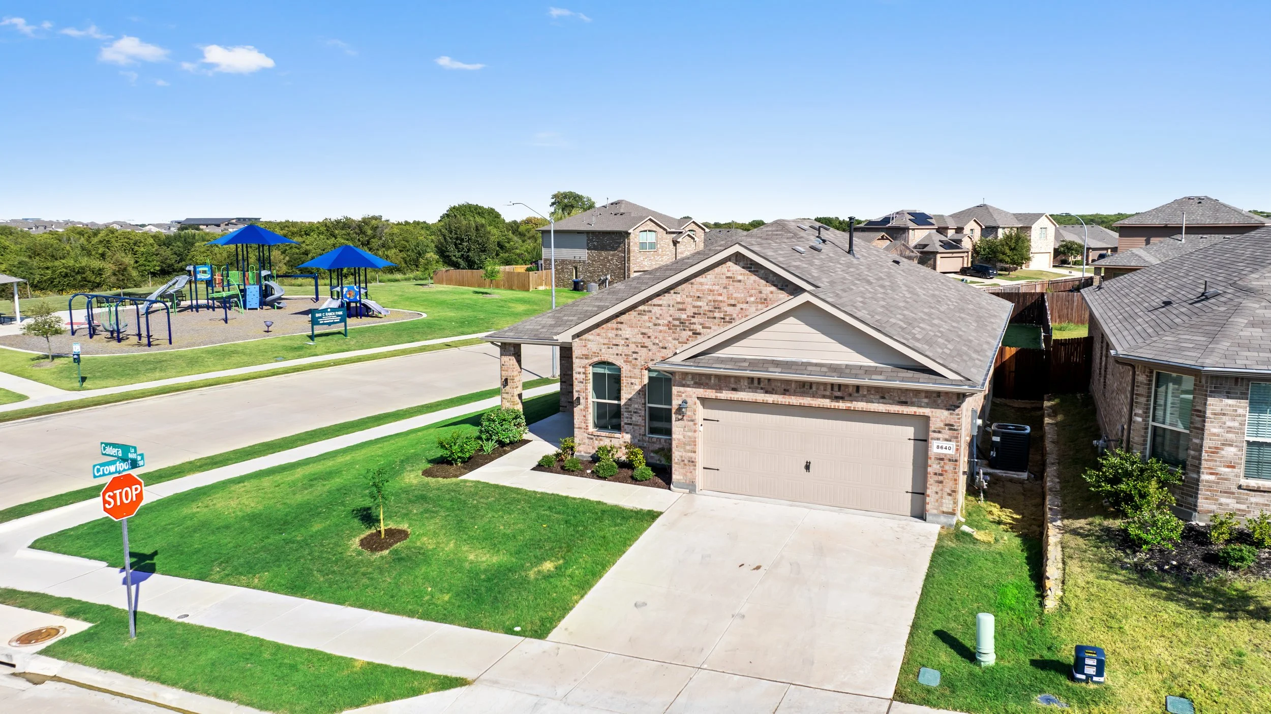 Aerial front view of a newly constructed two-story white brick home in Fort Worth, Texas, captured by No Worries Real Estate Photography for the DFW real estate market.